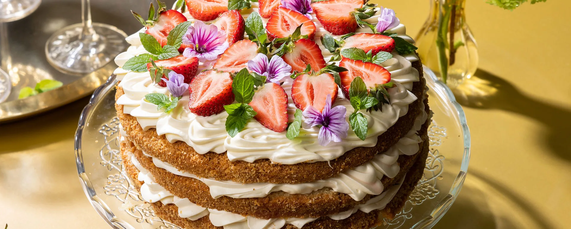 9. Toppa din cheesecake med sista fyllningen och resten av de marinerade jordgubbarna. Dekorera med mynta och ätbara blommor innan servering!