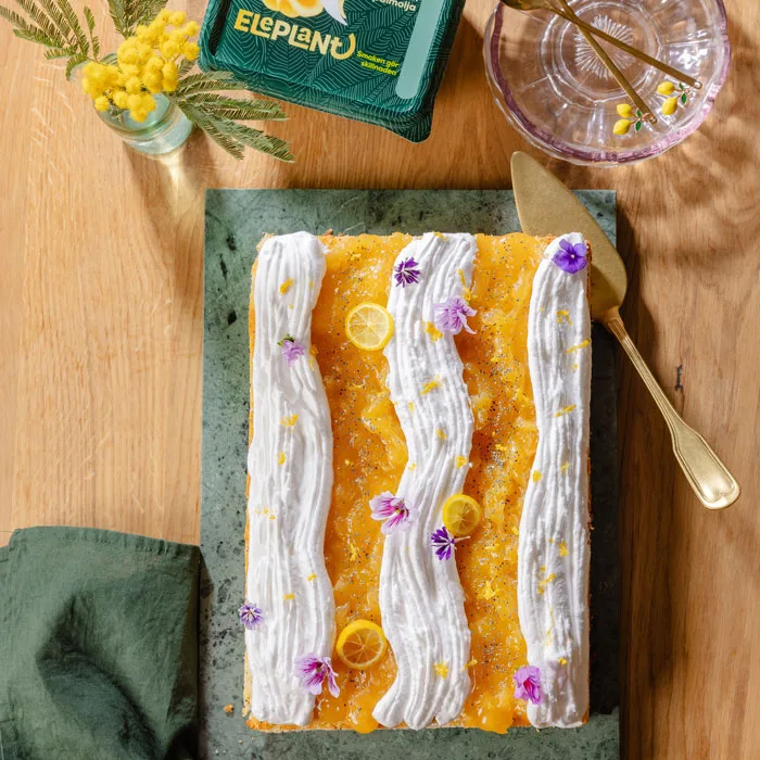 Baka en riktigt fluffig citronkaka med syrlig lemoncurd och italiensk maräng. När kakan är klar strösslar du över vallmofrön, rivet citronskal och ätbara blommor. Den här citronkakan bjuder på sött, syrligt, fluff, krisp och är dessutom otroligt vacker! Perfekt att baka till högtider och festligheter.