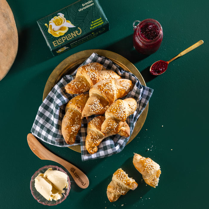Croissanter från grunden blir extra goda och funkar perfekt på frukostbordet. Gjorda på Eleplant blir de precis så smöriga och frasiga som man vill ha dem. Servera nybakade med marmelad, eller toppa med frön innan gräddning för ett matigare tilltugg.