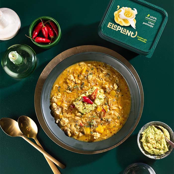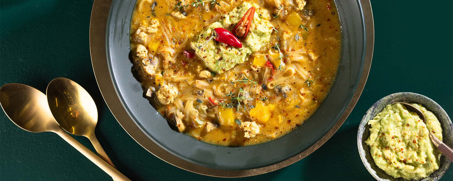 Enkel och snabb kyckling- och nudelsoppa med asiatiska smaker. Kokosmjölken ger fyllig smak, och avokadoröran med lime gör den komplett. Vi använder risnudlar, men det går bra att byta. Comfort food när det är som bäst.
