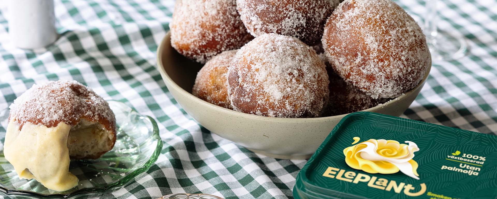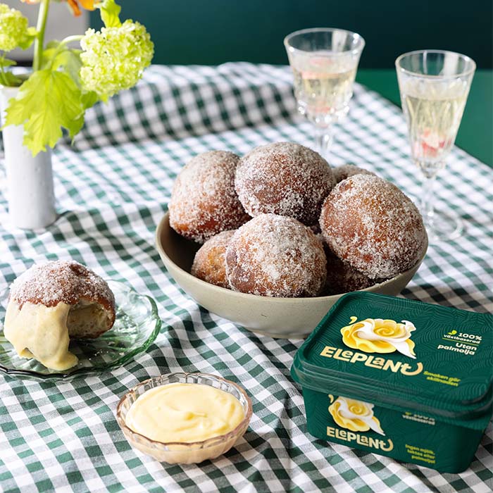 Rabarbermunkar fyllda med vaniljkräm. Att göra munkarna är enkelt och kul - nyfriterade och doppade i socker blir de grymt goda. Vi gör våra på Eleplant, och vill du göra dem helt veganska så byt bara ut ägg och mejeriprodukter mot växtbaserade alternativ.
