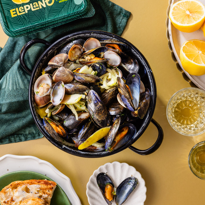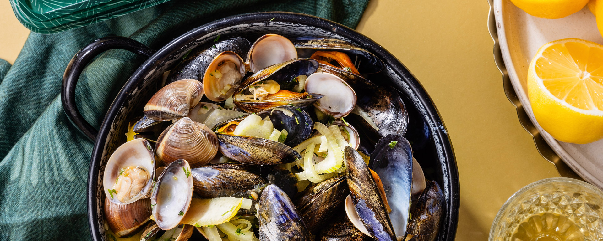 Ett riktigt gott recept på musslor i vinsås med smaker av fänkål, vitlök och citron. Musslor är enkelt att laga men känns lyxigt att äta. Musslorna kokas bara en kort stund och sen är det klart att njuta. Serverar du pommes frites till så har du en komplett Moules frites! Att ha krispiga pommes eller doppa rostat lantbröd i skyn är halva grejen med musslor! Om du föredrar den lite krämigare varianten är det bara att tillsätta 1–2 dl grädde till musslorna under sjudningsfasen.