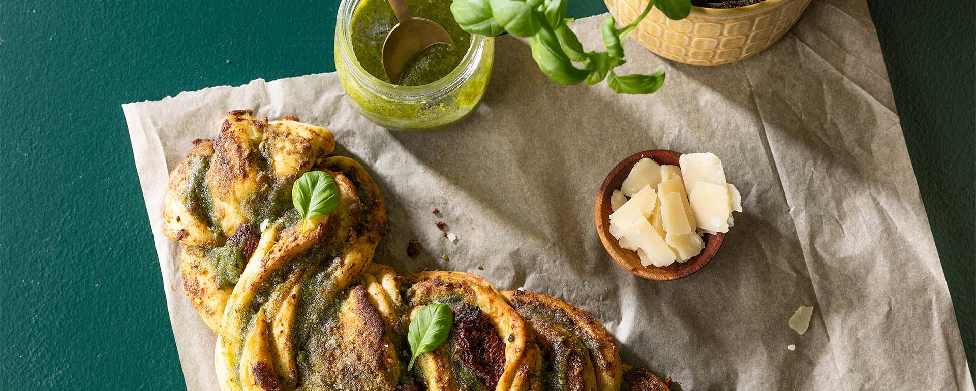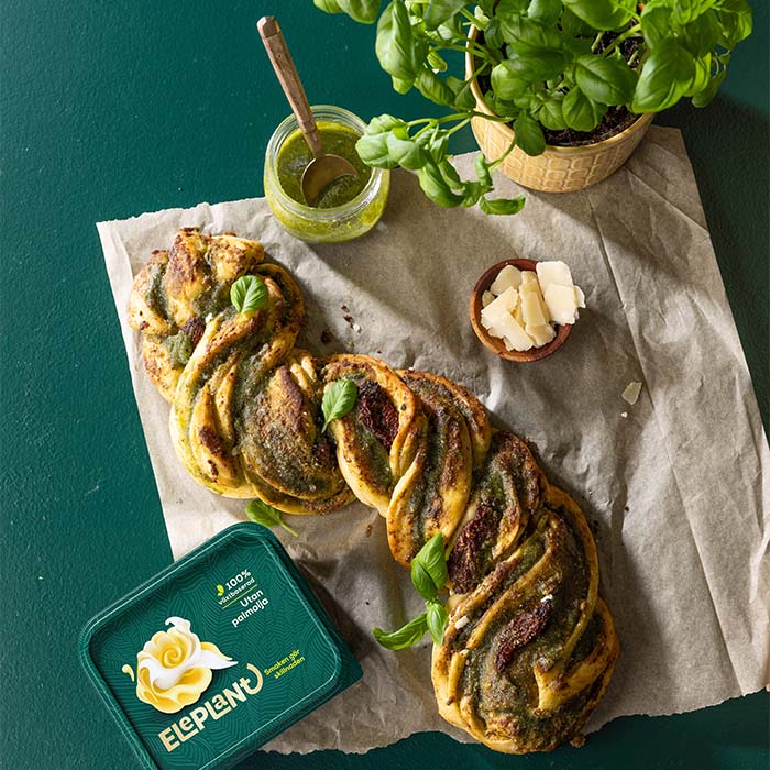 Saftigt pestobröd med soltorkade tomater - gott som det är, som tillbehör till soppa, eller på tapasbrickan. Vill du förenkla det? Använd färdigköpt pesto. Enkelt och snyggt.