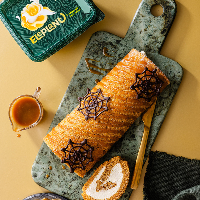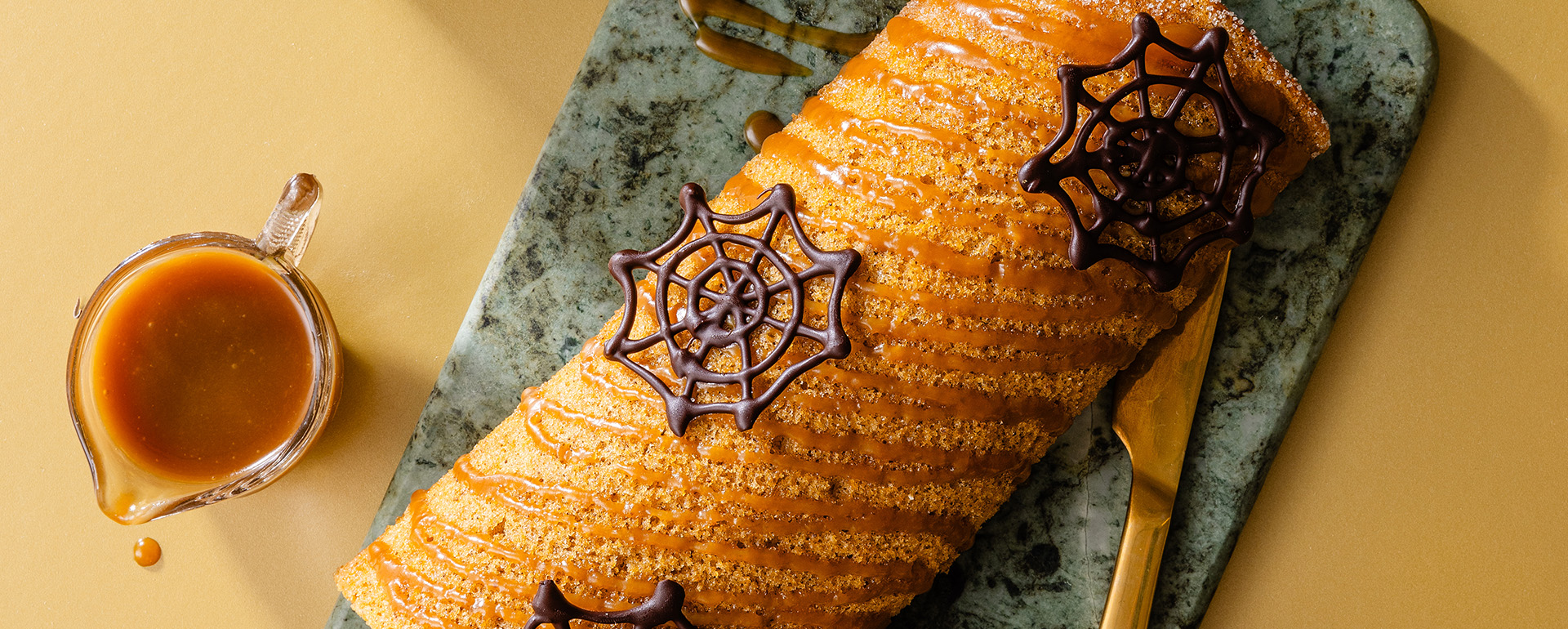 Rulltårta går ju att äta året runt, men till Halloween bakar vi den med pumpa och dekorerar den med spindelnät gjorda av choklad. I det här receptet kokar vi ihop en god kolasås som du kan ringla över hela rulltårtan eller ha i en liten kanna bredvid. Tips! Om du inte hittar pumpapuré i din butik kan du enkelt göra den själv genom att koka skalade pumpabitar tills de är genomkokta och sedan puréa dem med en stavmixer tills du har en slät puré. Här har vi dekorerat rulltårtan med spindelnät som vi gjort med smält choklad, men du kan även välja att ha på chokladströssel eller andra dekorationer.
