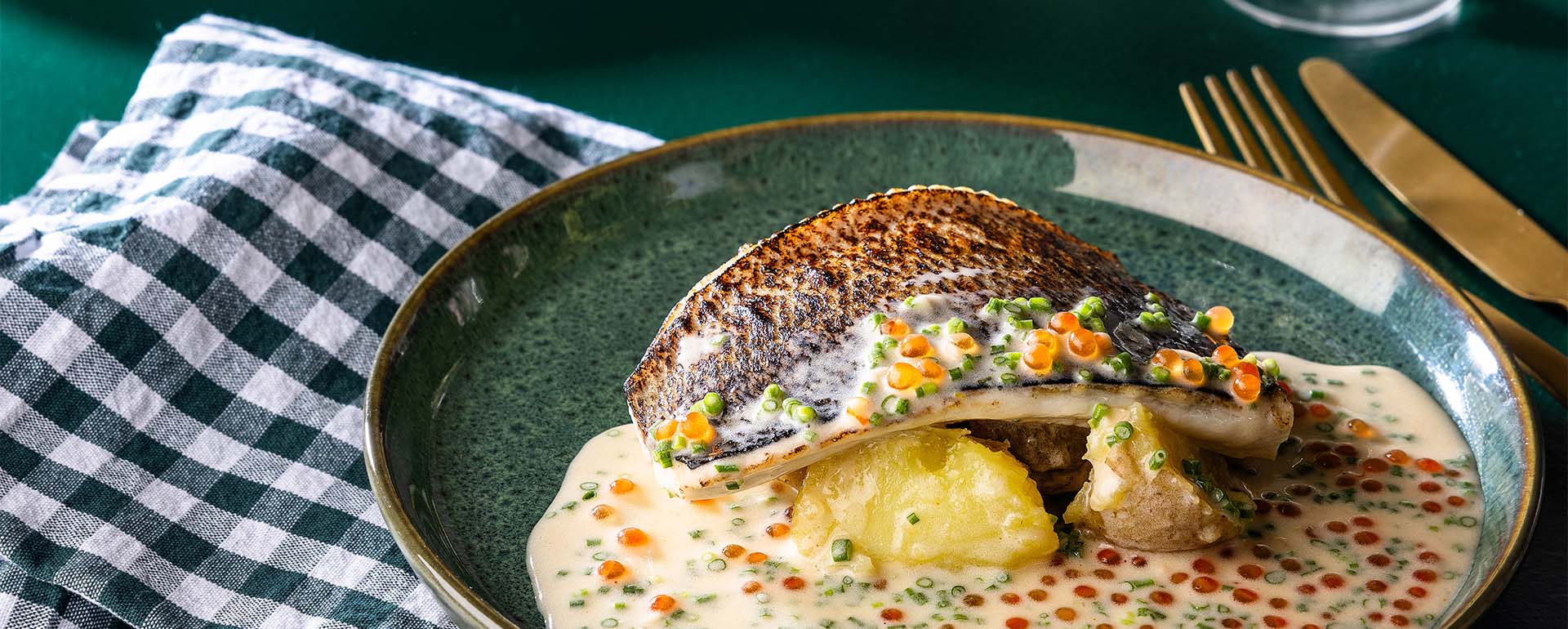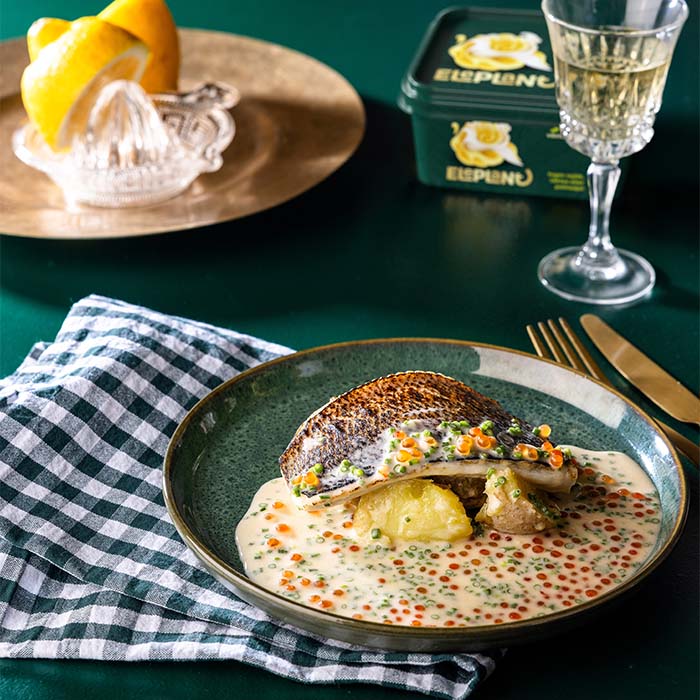 Fiskrätt med en modern touch. Den krämiga romsåsen och krossade potatisen får sin smak av... you guessed it, Eleplant! Klassiskt recept från Matias Haapsaari, kock i Finlands kocklandslag.