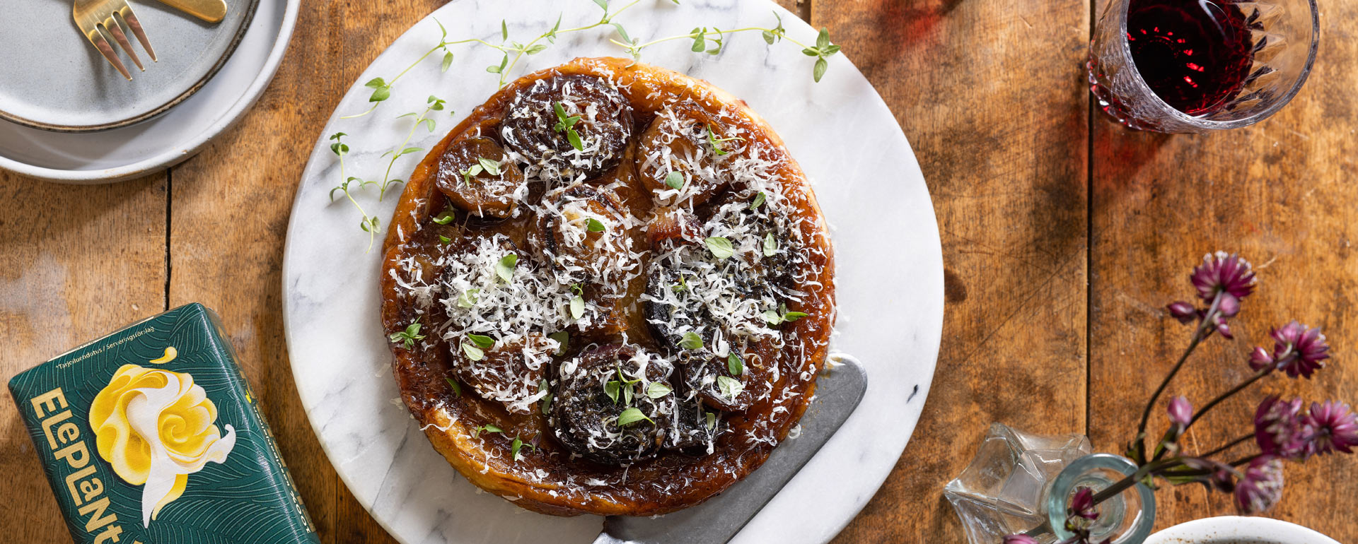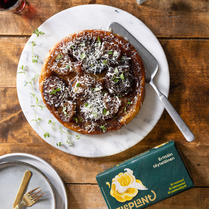 Franska klassikern tarte tatin, men med karamelliserad röd- och schalottenlök istället för äpplen. Perfekt som förrätt eller tilltugg, gör sig även bra i matlådan. Sött, syrligt och salt under ett sprött smördegstäcke - funkar i de flesta sammanhang.